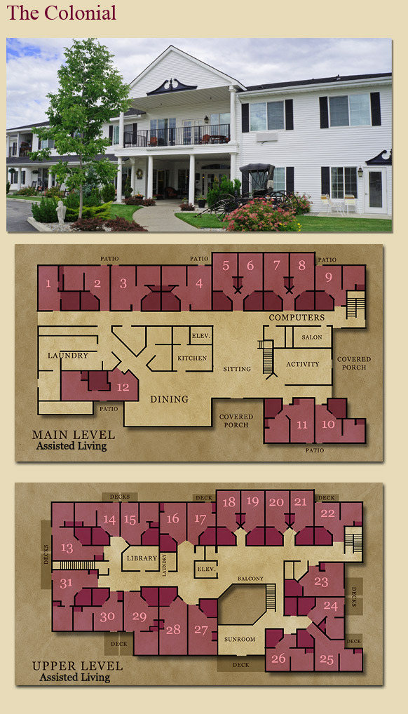 The Colonial is a classic, colonial-style residence featuring a welcoming covered entry, traditional white exterior, and signature black shutters. Inside, residents enjoy warm, home-like living spaces with a cozy central fireplace, comfortable common areas, and an easy-to-navigate layout. Designed for comfort, safety, and familiarity, the Colonial offers a peaceful, residential setting where seniors feel truly at home.